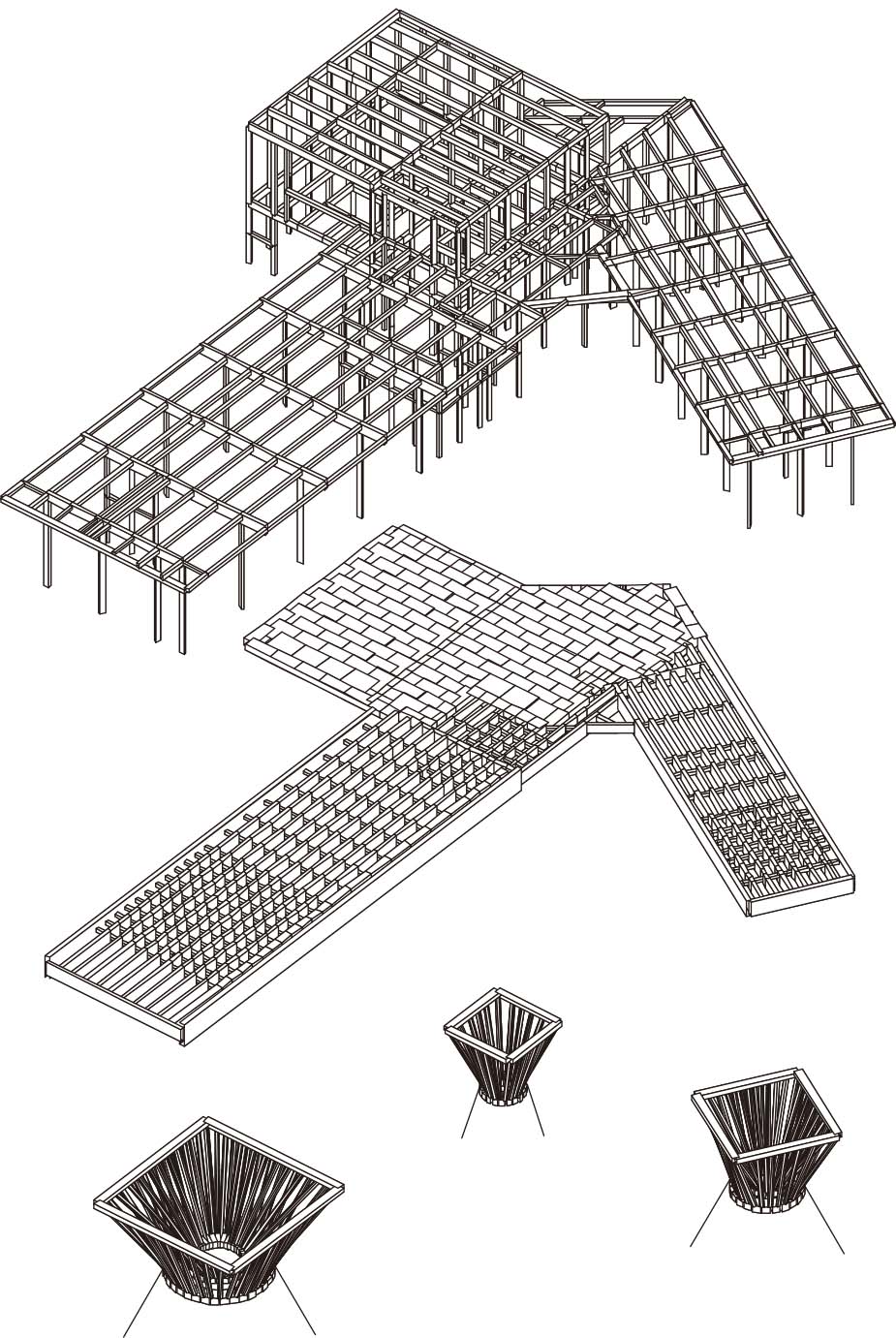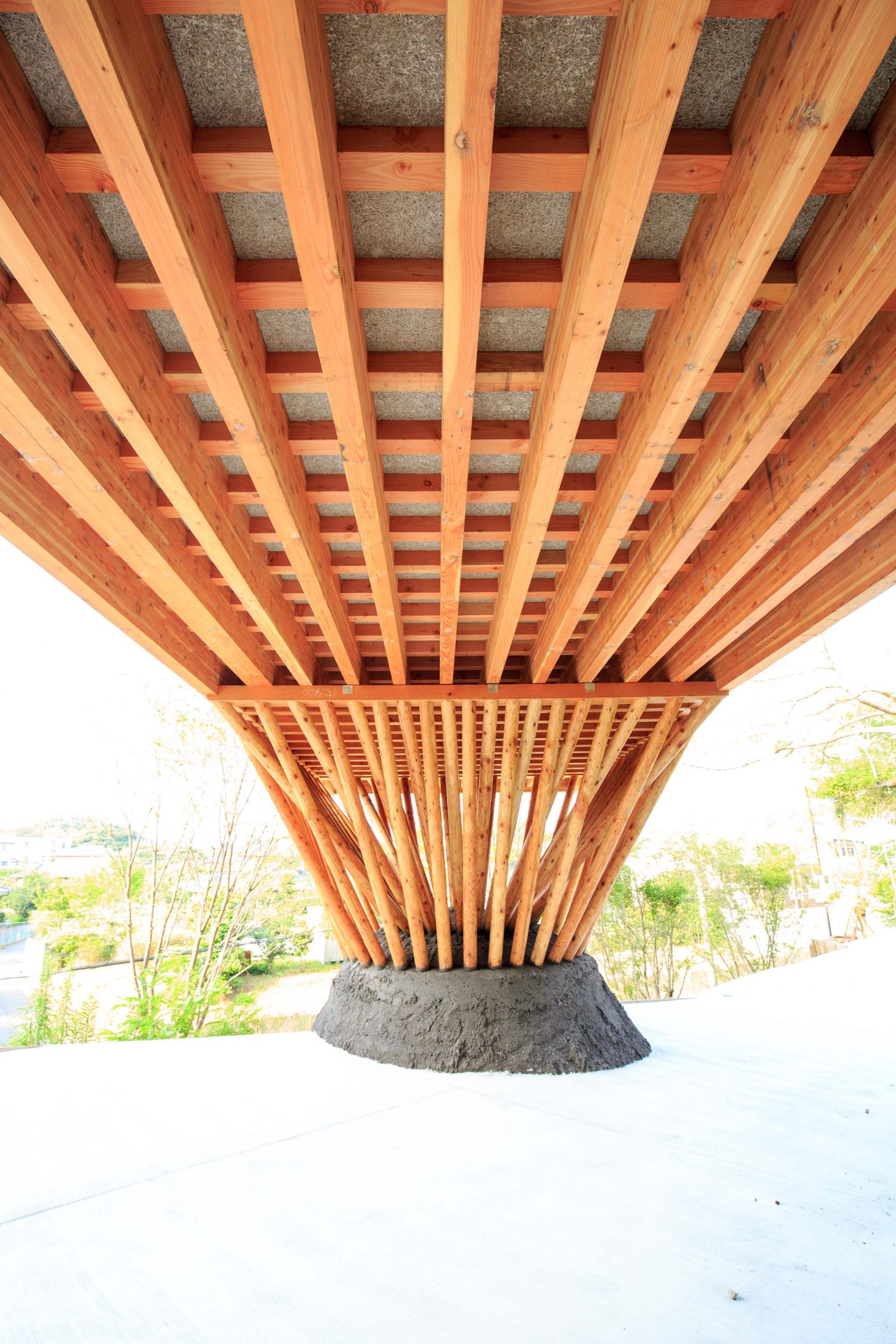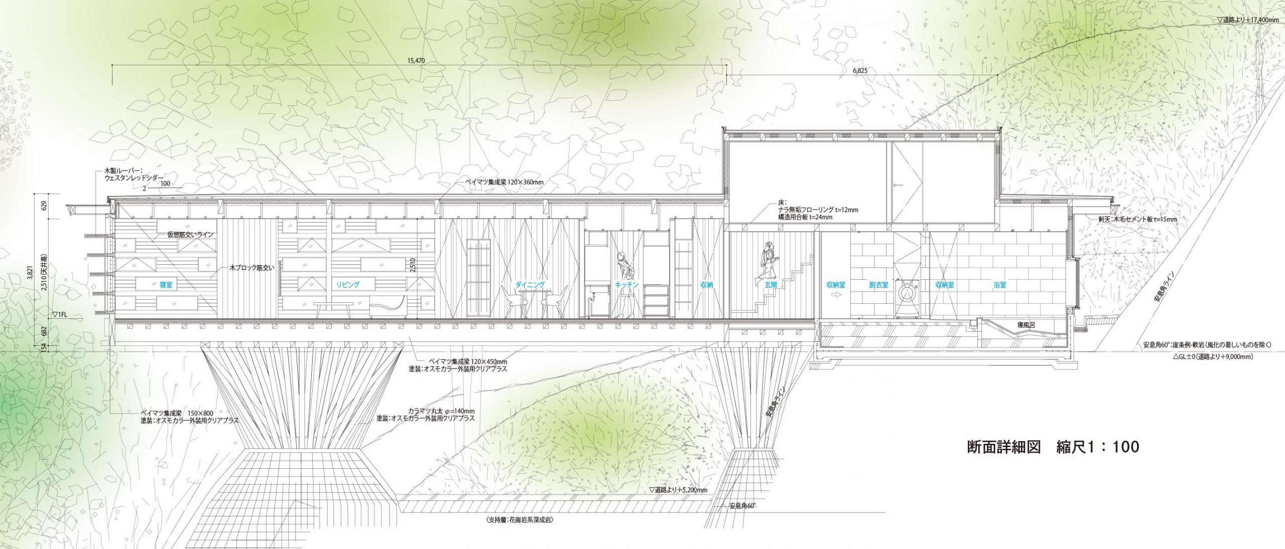 五浦の海、岡倉天心六角堂近傍の本敷地は、縦に岩盤層が隆起した天然の「基壇」、丘の一角にあり、平屋居室部を後方の丘より谷側に突出させた木造懸造の構成である。2方向に突出した棟屋先端部下とその付け根部下の計3箇所、岩盤部に直接コンクリート(スランプ8cm)を盛上げた高さ3m程度の円錐型「礎石」を設ける。そこから基本下部2重、上部1重輪列からなる140φ丸太材を放射状に並べた「束」群を設け、それと丘の間に360~800mm成の木梁を架渡し、人の営みの「床」をあらためて海(谷)と山(丘)の間に成立させている。木造外周壁は、内外装を担う120mm厚の木ブロックを斜めに配し、耐力壁として機能させた。